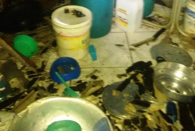 Por conta da explosão, a casa teve a estrutura danificada. Os telhados e os móveis da cozinha ficaram destruídos.