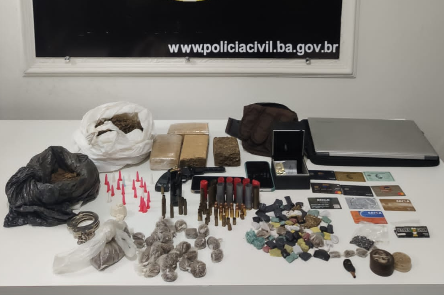 Na casa de um deles, em Seabra foram localizados, arma, porções de maconha, pinos de cocaína, cartões de crédito e munições. Ele também foi autuado em flagrante por tráfico de drogas. Aparelhos eletrônicos foram apreendidos para ajudar nas investigações.
