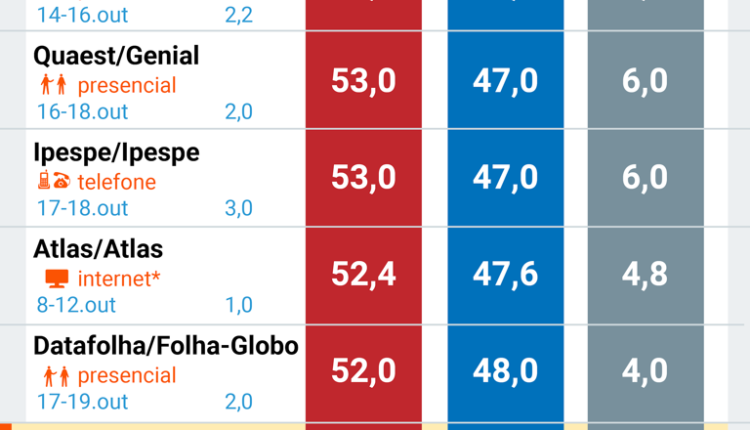 As últimas pesquisas Quaest e Ipespe registraram a mesma porcentagem para os candidatos: 53% para o petista e 47% para o atual presidente.A 7 dias do 2º turno, vantagem de Lula varia de 2,6 a 8 pontos© Fornecido por Poder360