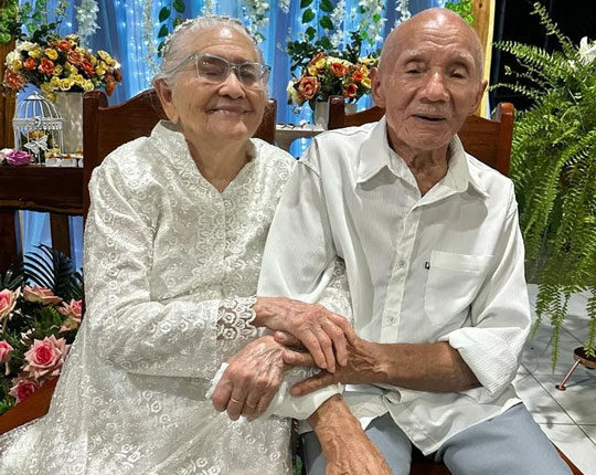 Imagine quantas histórias é possível vivenciar ao longo de quase oito décadas. O casamento de Maria Alves Ribeiro e Domingos Costa Silva, com 78 anos de união, é exemplo disso. Ela, com 93 anos de idade, e ele, com 97, celebraram as bodas de Benjoim ao lado dos 14 filhos e parte dos 58 netos, 89 bisnetos e 33 tataranetos em Boa Vista, Roraima.