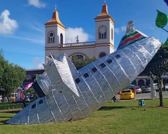 A estrutura foi colocada em frente a uma igreja e mostra supostamente a parte dianteira da aeronave em contato com o solo.
