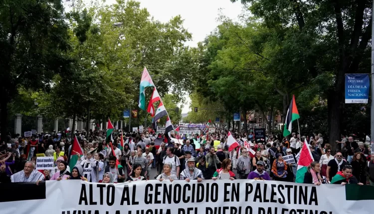 Milhares de manifestantes saíram às ruas em várias cidades importantes do mundo neste sábado (5) para exigir o fim do derramamento de sangue em Gaza, à medida que o conflito no enclave palestino se aproxima de seu primeiro aniversário e se espalha pela região.
