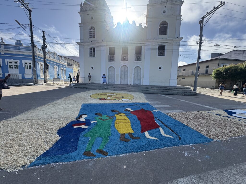 “Os tapetes expressam a fé e o amor do povo pela Eucaristia. Cada grupo confecciona seu tapete com materiais recicláveis, como serragem colorida, flores, folhas e pó de serra, sempre respeitando a sustentabilidade”, disse o padre.