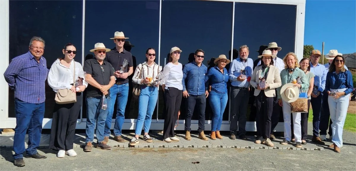 Entre os dias 17 e 19 de junho, a missão percorreu os municípios de Luís Eduardo Magalhães, Formosa do Rio Preto e Riachão das Neves, conhecendo experiências locais nas áreas de agricultura regenerativa, integração lavoura-pecuária-floresta (ILPF), rastreabilidade e recuperação de pastagens degradadas.