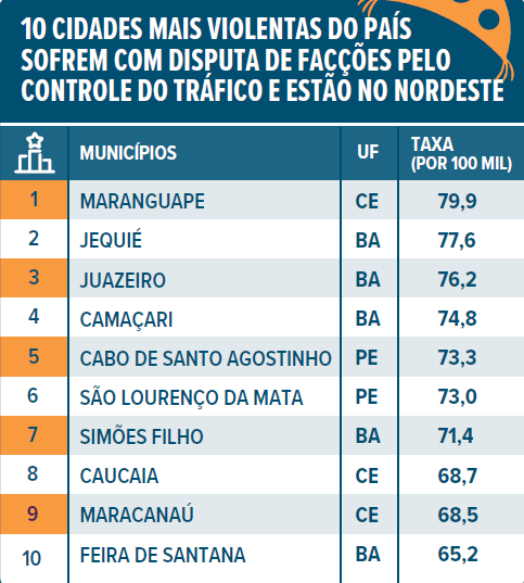 A lista é organizada com base no número (taxa) de homicídios a cada 100 mil habitantes. Feira de Santana, cidade conhecida como Princesa do Sertão, apesar de ocupar a última posição na lista, possui uma taxa de homicídios superior à do estado. 16 das 20 cidades mais violentas de todo o Brasil estão no Nordeste.