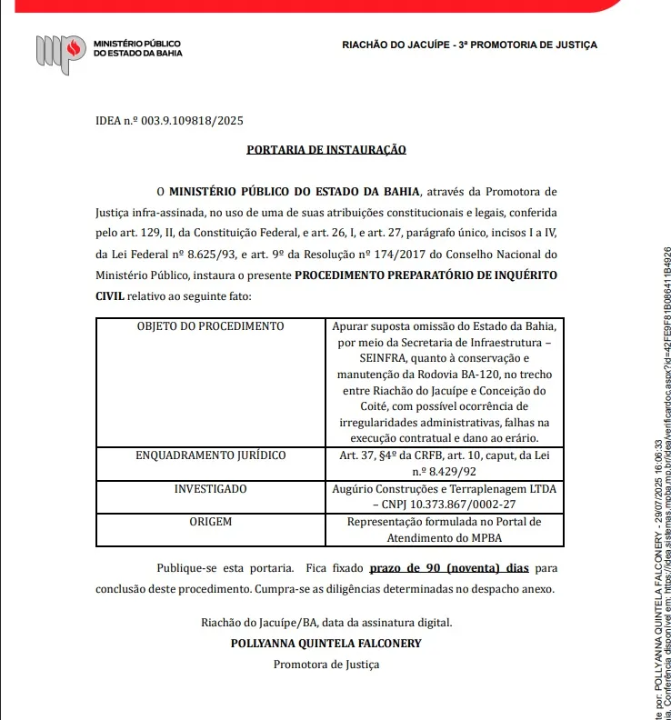 De acordo com a portaria assinada digitalmente pela promotora, o procedimento tem como objeto “apurar suposta omissão do Estado da Bahia, por meio da Secretaria de Infraestrutura – SEINFRA, quanto à conservação e manutenção da Rodovia BA-120, no trecho entre Riachão do Jacuípe e Conceição do Coité, com possível ocorrência de irregularidades administrativas, falhas na execução contratual e dano ao erário”.
