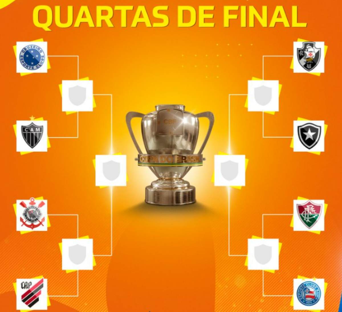 Agência Brasil – Dois clássicos regionais – Cruzeiro x Atlético-MG e Vasco x Botafogo – estão entre os confrontos mata-mata (ida e volta) das quartas de final da Copa do Brasil, definidos por sorteio nesta terça-feira (12), na sede da CBF, no Rio de Janeiro. Os outros duelos serão entre Athletico-PR x Corinthians, e Bahia x Fluminense. Terão a oportunidade de decidir a classificação jogando em casa o Cruzeiro, o Corinthians, o Botafogo e o Fluminense. As partidas das quartas ocorrerão nas semanas de 27 de agosto a 11 de setembro. As datas, horário e locais ainda serão divulgados pela CBF.