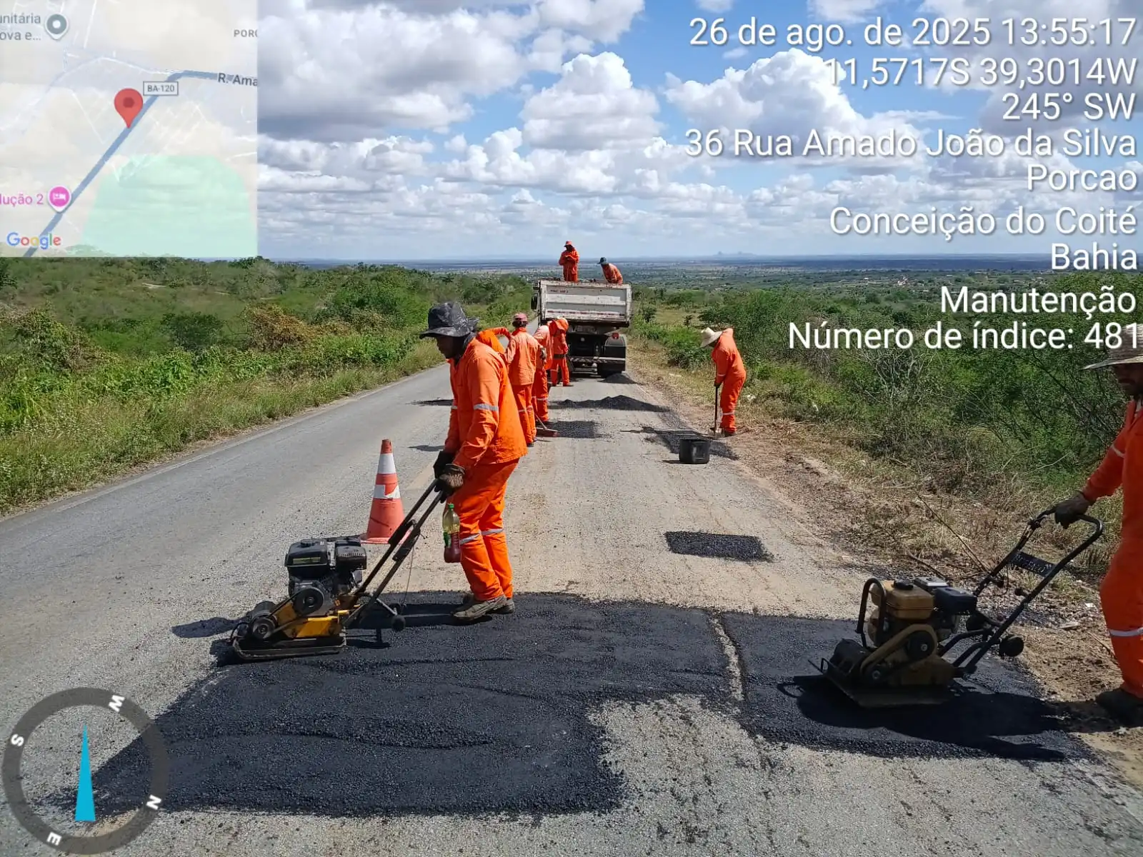 A Secretaria de Infraestrutura da Bahia (Seinfra) informou, no início da tarde desta quarta-feira (27), que iniciou serviços de manutenção no trecho da BA-120 que liga Conceição do Coité a Riachão do Jacuípe. O comunicado foi acompanhado de fotos que mostram equipes trabalhando na operação conhecida como “tapa-buraco”.