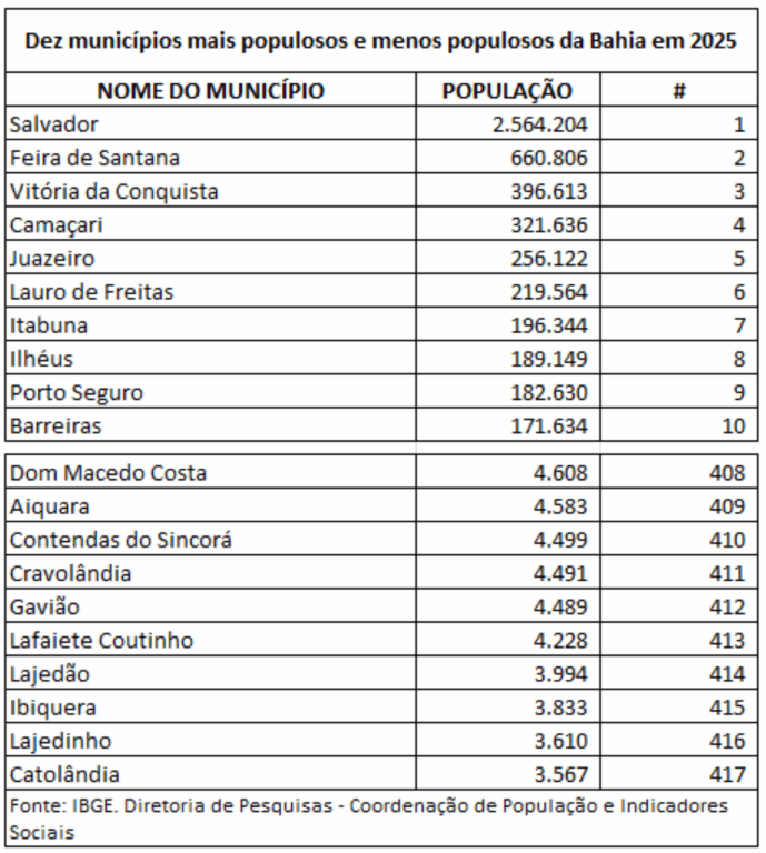 Segundo o IBGE, os 10 municípios baianos com menores populações na estimativa de 2025 também foram os mesmos de 2024, mas com uma mudança na ordem: Contendas do Sincorá (4.499 habitantes) subiu duas posições entre um ano e outro, ultrapassando Cravolândia (4.491 habitantes) e Gavião (4.489).