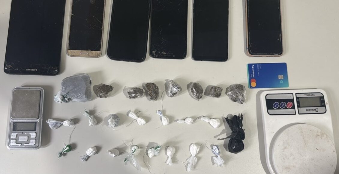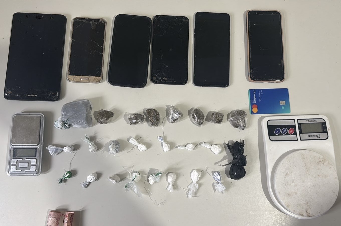 Durante a abordagem, o suspeito foi flagrado manuseando um material suspeito enquanto gravava um vídeo. Os policiais apreenderam dez porções de cocaína e quinze de maconha, além de balança de precisão, tablet e celulares.