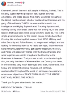 “Khamenei, uma das pessoas mais malignas da História, está morto. Isso não é apenas justiça para o povo do Irã, mas para todos os grandes americanos e para pessoas de muitos países ao redor do mundo que foram mortas ou mutiladas por Khamenei e seu bando de capangas sanguinários. Ele não conseguiu escapar de nossos sistemas de inteligência e de rastreamento altamente sofisticados e, trabalhando em estreita colaboração com Israel, não havia nada que ele, ou os outros líderes mortos junto com ele, pudessem fazer.