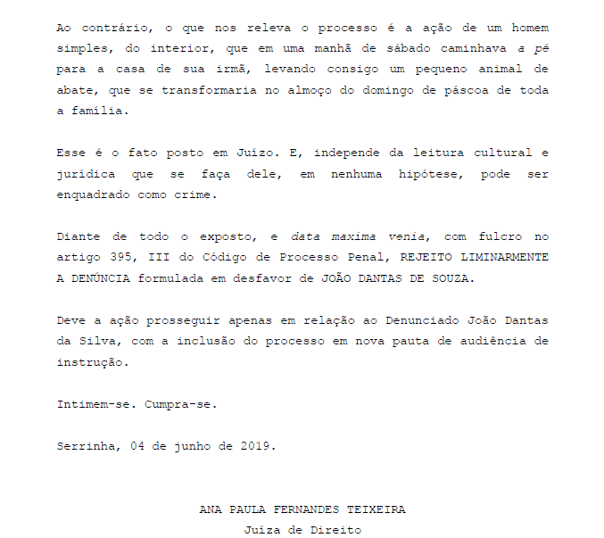Conforme a decisão, o fato não pode ser enquadrado como crime. “O que nos releva o processo é a ação de um homem simples, do interior, que em uma manhã de sábado caminhava a pé para a casa de sua irmã, levando consigo um pequeno animal de abate, que se transformaria no almoço do domingo de páscoa de toda a família”. (ver decisão abaixo)